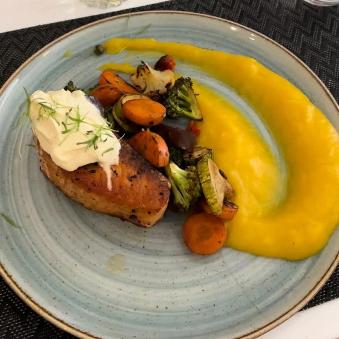 Grelhado com purê de mandioquinha salsa, legumes grelhados e molho de limão.